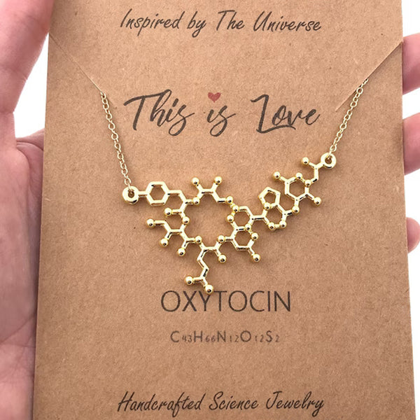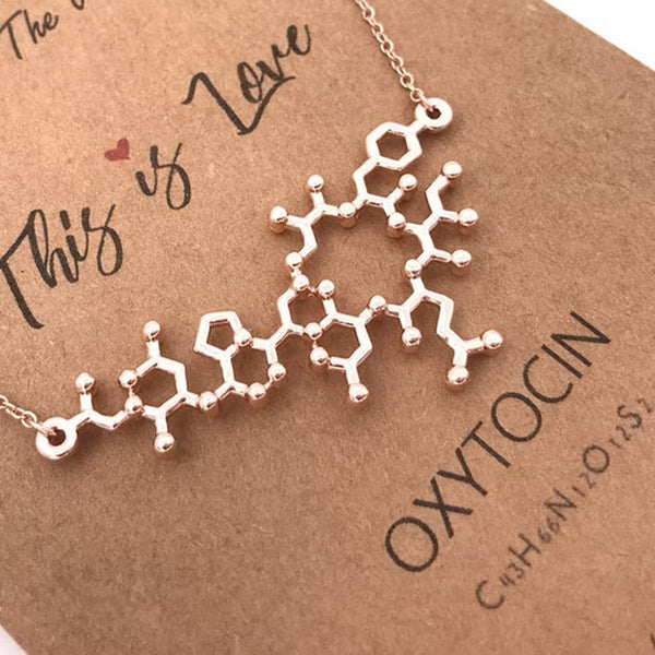 The oxytocin molecule is a symbol of love, compassion, and human connection, making this necklace the perfect gift for anyone who values meaningful relationships and emotional bonds. The necklace can be worn on its own or layered with other pieces, adding a touch of elegance and sophistication to any outfit.